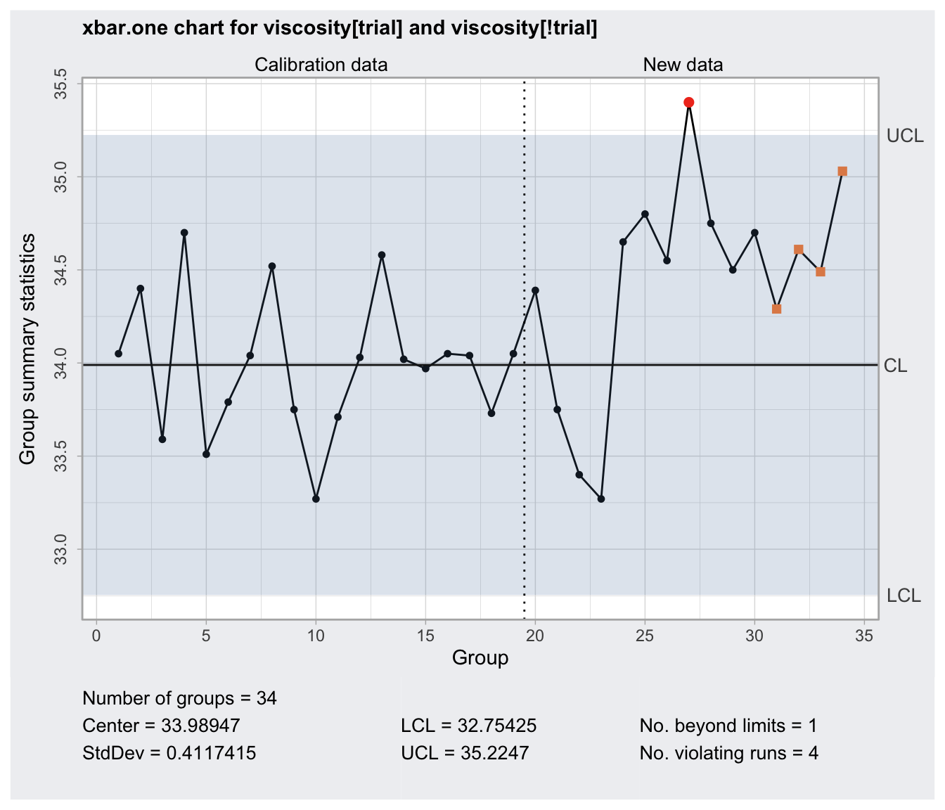 qcc(viscosity[trial], type = "xbar.one", newdata = viscosity[!trial])))